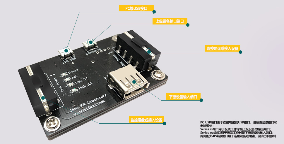 設(shè)備連接方便,軟件操作簡單,可以支持多個設(shè)備級聯(lián)工作,同時監(jiān)控多個硬盤的工作情況,僅需要第一個設(shè)備接入電腦的USB接口即可。軟件支持實時顯示監(jiān)控情況,并將監(jiān)控信息保存為本地文件,用戶可以導(dǎo)入本地文件查看電流電壓的波動情況。