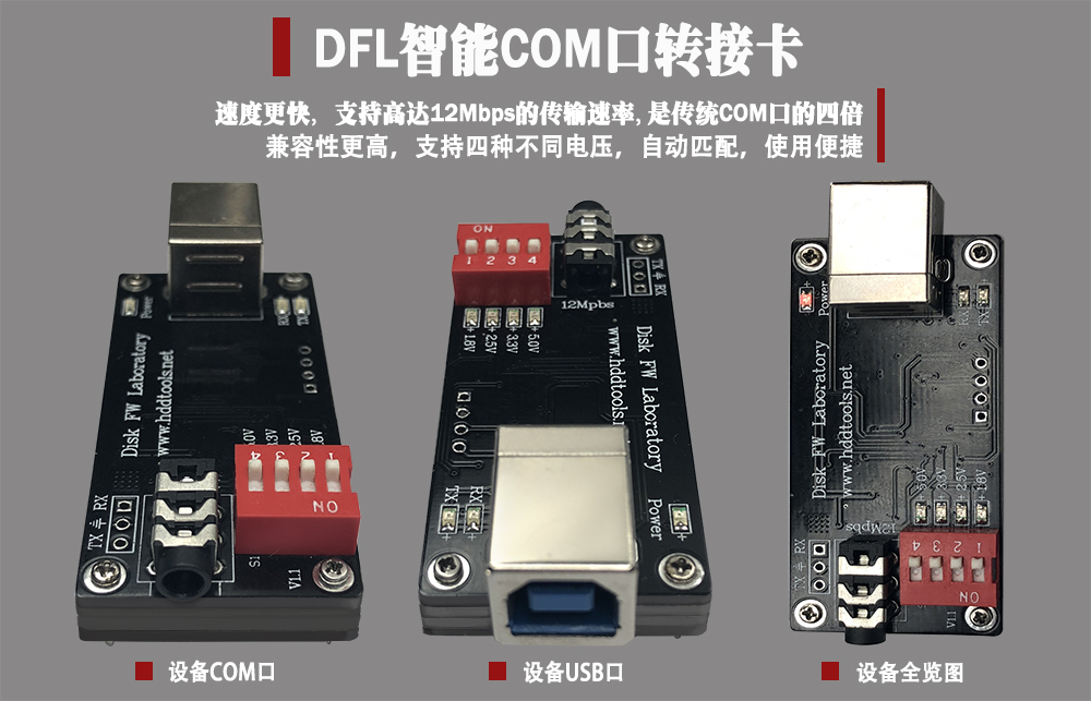 DFL智能COM口轉(zhuǎn)接卡支持1.8V,2.5V,3.3V,5.0V四種電壓,同時,DFL智能COM口轉(zhuǎn)接卡自動分析硬盤COM電壓并切換為匹配的電壓。以滿足不同品牌的需求,達(dá)到最佳通信狀態(tài)。